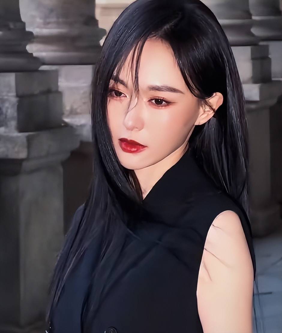一身简约的黑色无袖上衣搭配阔腿裤,穿在她身上颇为动人,黑色长发随意披散,搭配大红唇明艳大方,眼神自带故事感,一站便是风情万种,着实美丽。